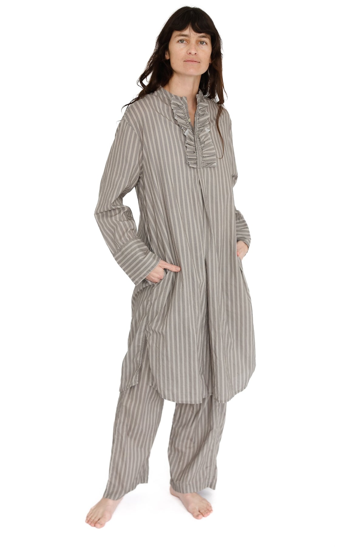 Ready to ruffle your featherbed?  The ruffled version of our Nightshirt features a touch more flare around its 3-button-down front.  We love it on its own, over PJ bottoms, and layered over slips.  Slip on.  Have fun.