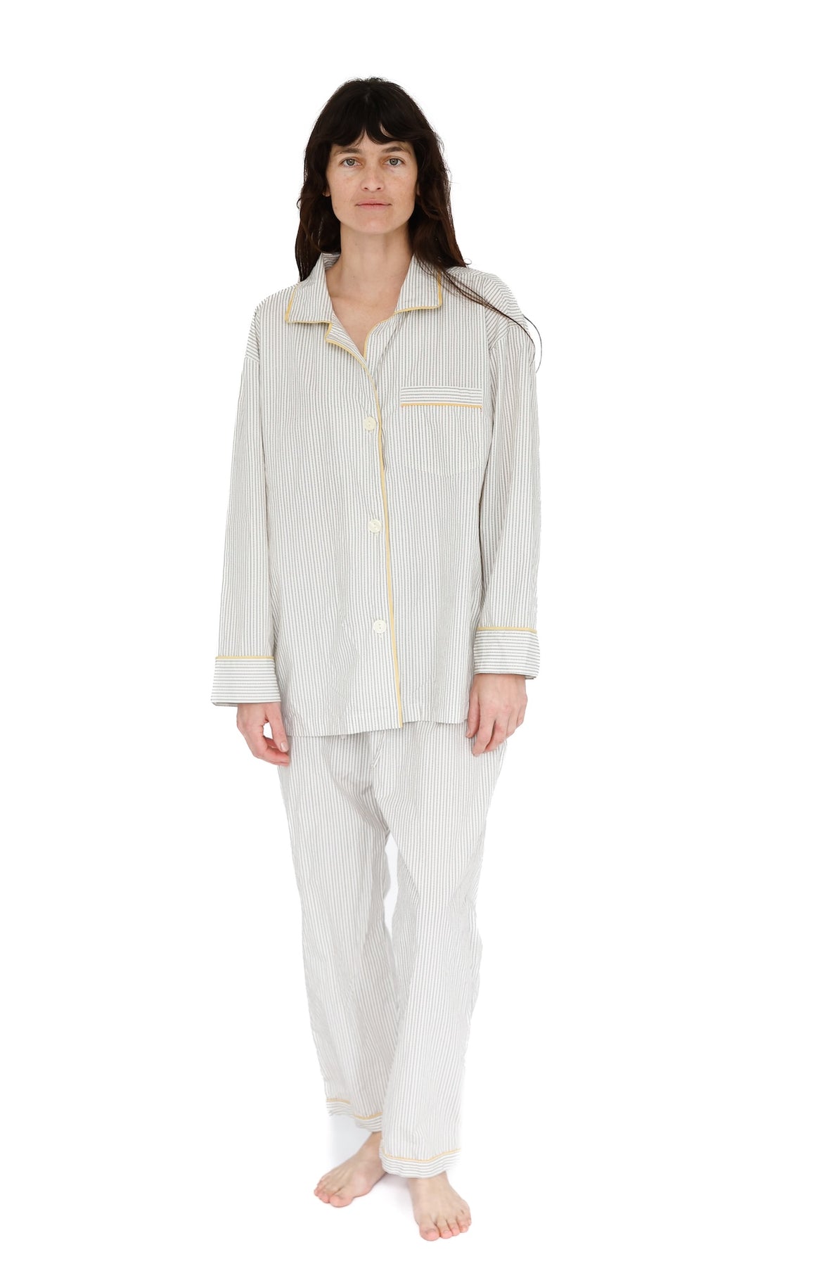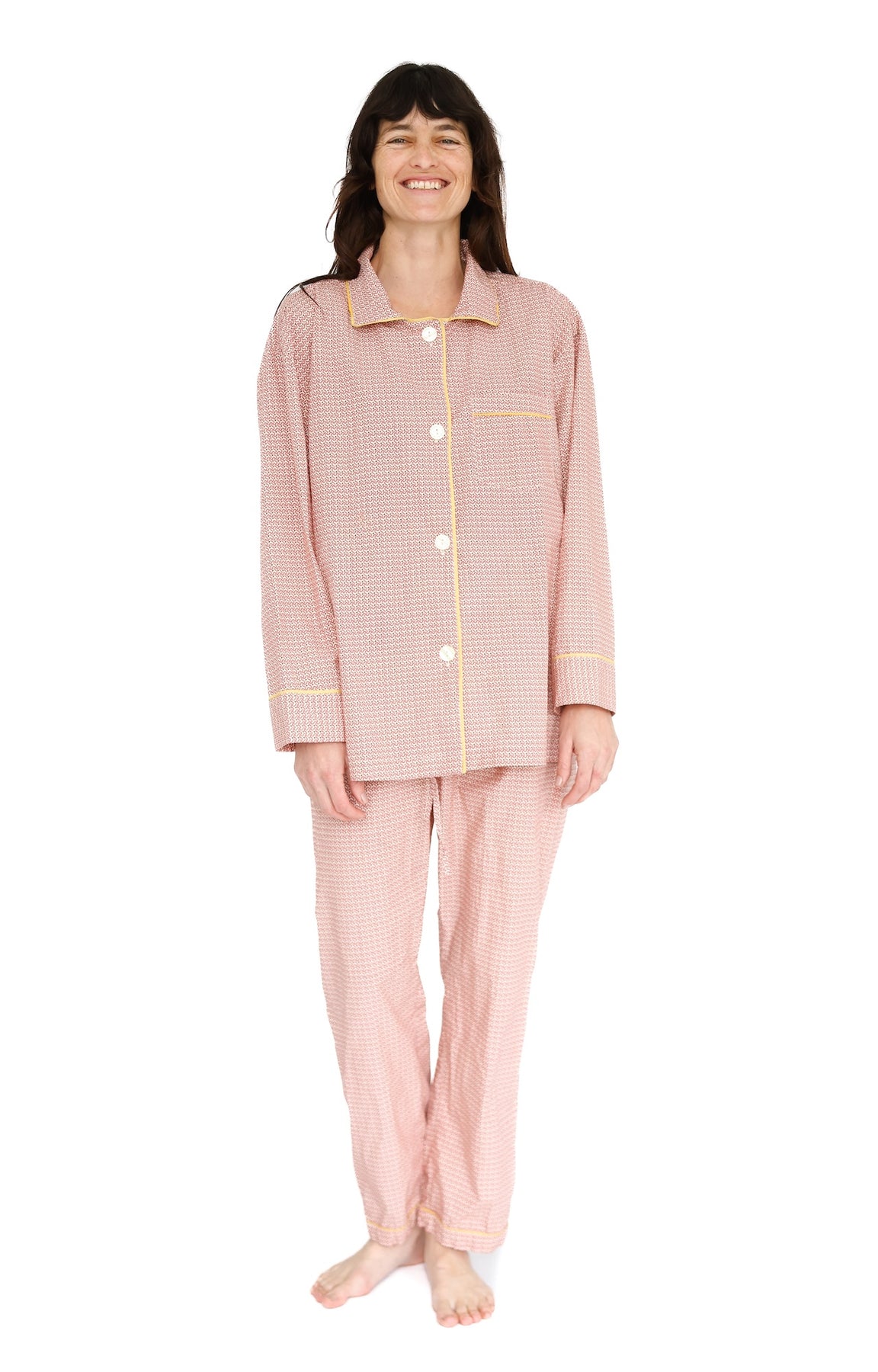 Overscheduled?  Overwhelmed?  Our Oversize PJ Set is the quickest way to get over it. The fit is “baggie-boyfriend”, with a generously cut, one-pocket top and loose, low-rise drawstring pant.  Wear them paired or as separates. Over and out.