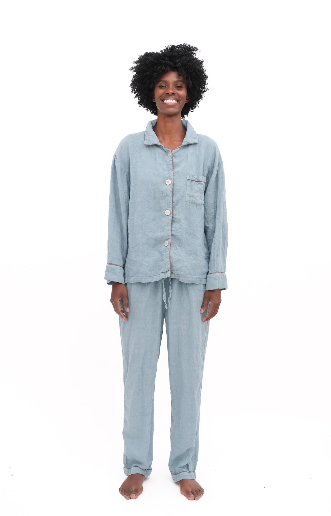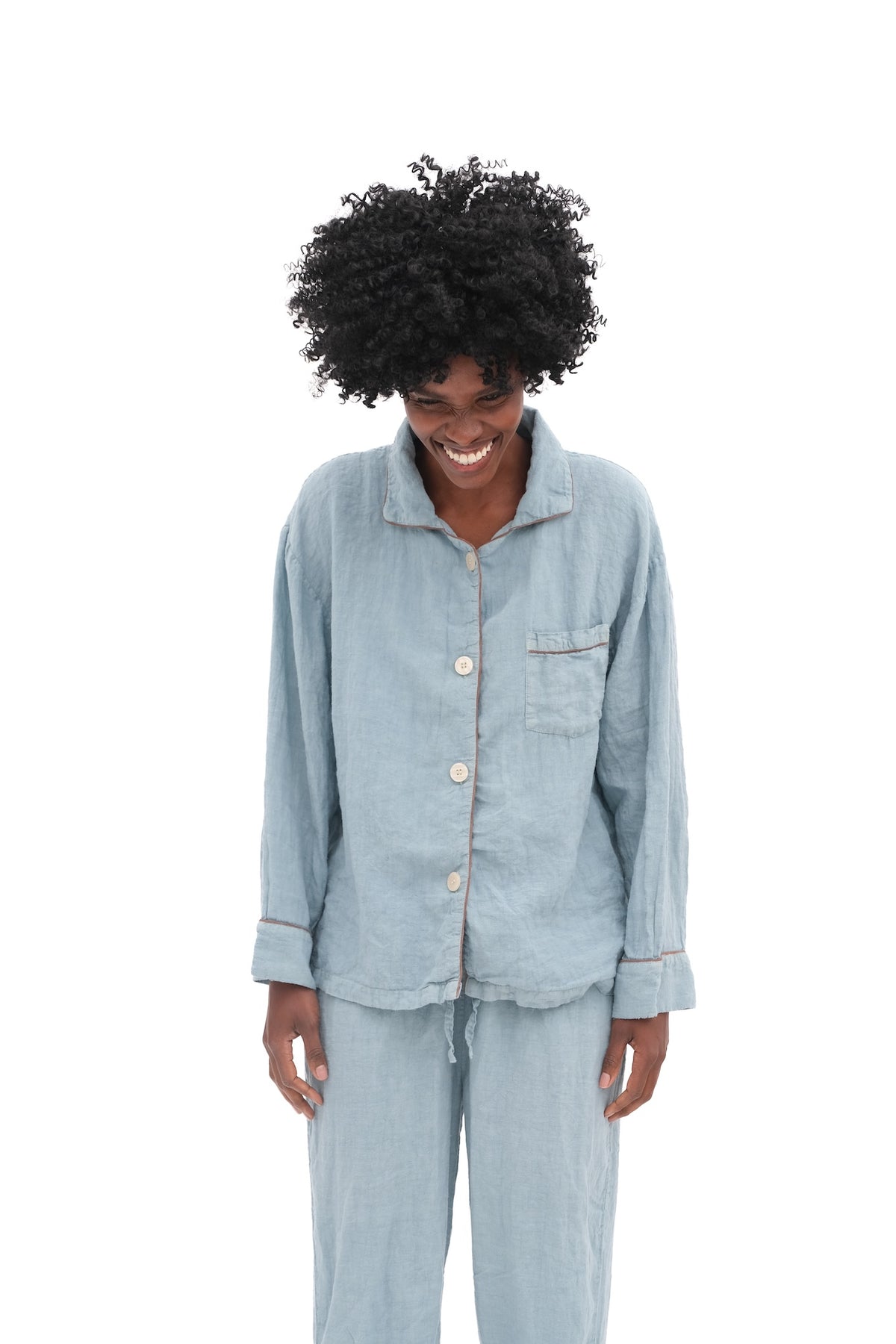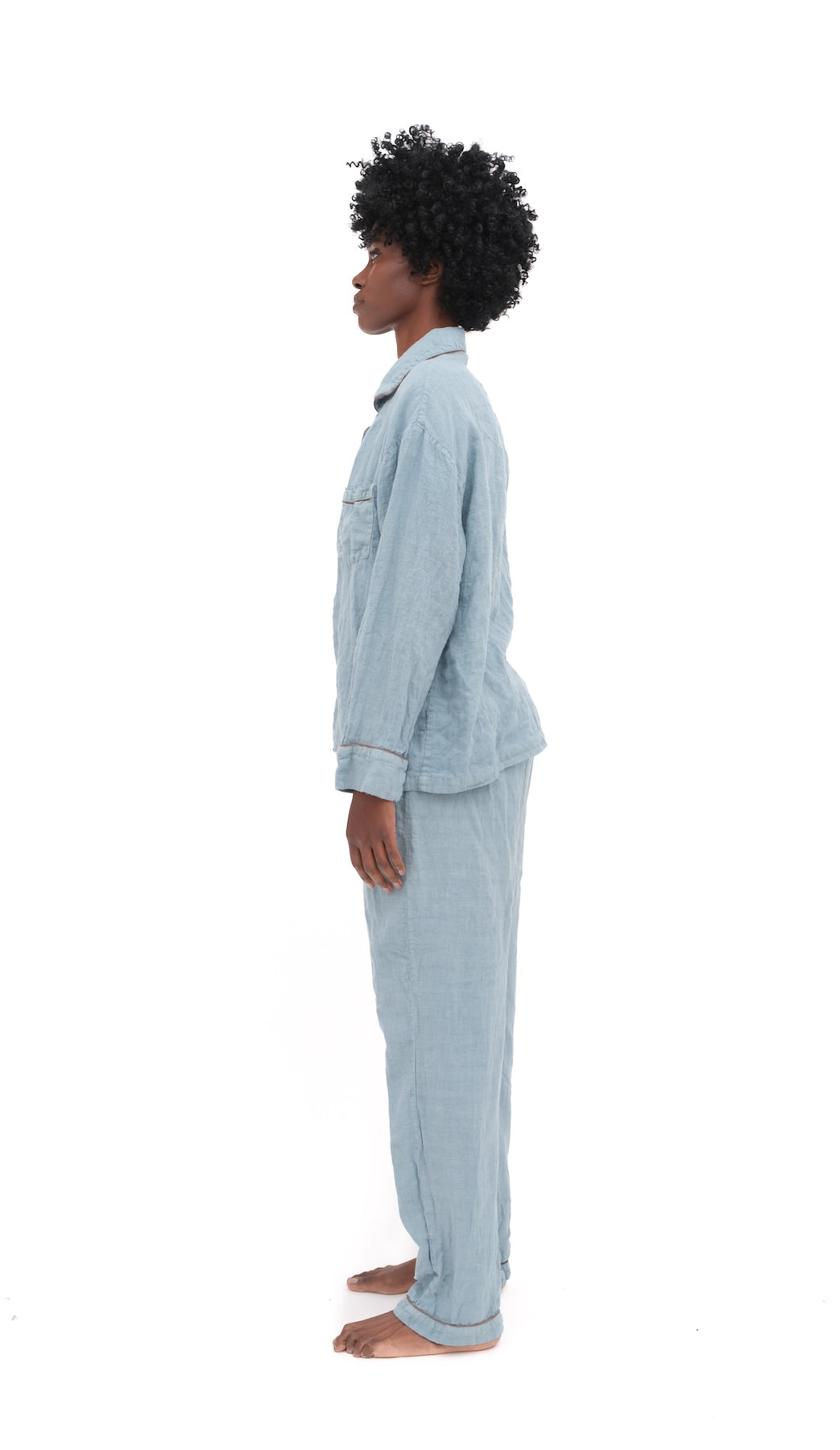 Overscheduled?  Overwhelmed?  Our Oversize PJ Set is the quickest way to get over it. The fit is “baggie-boyfriend”, with a generously cut, one-pocket top and loose, low-rise drawstring pant.  Wear them paired or as separates. Over and out.