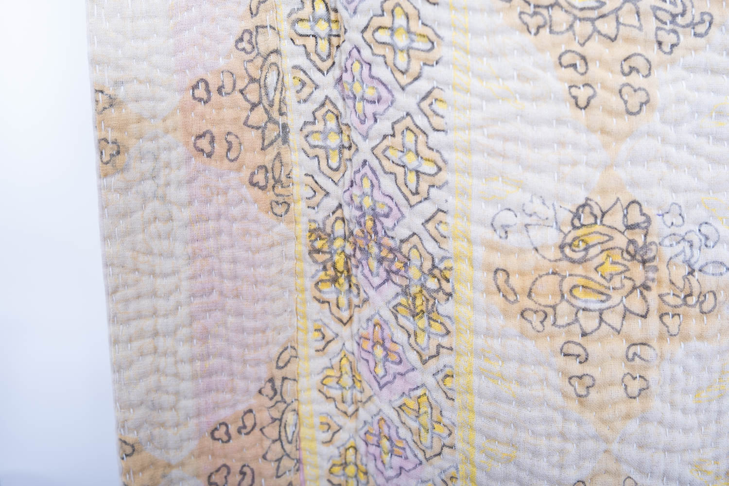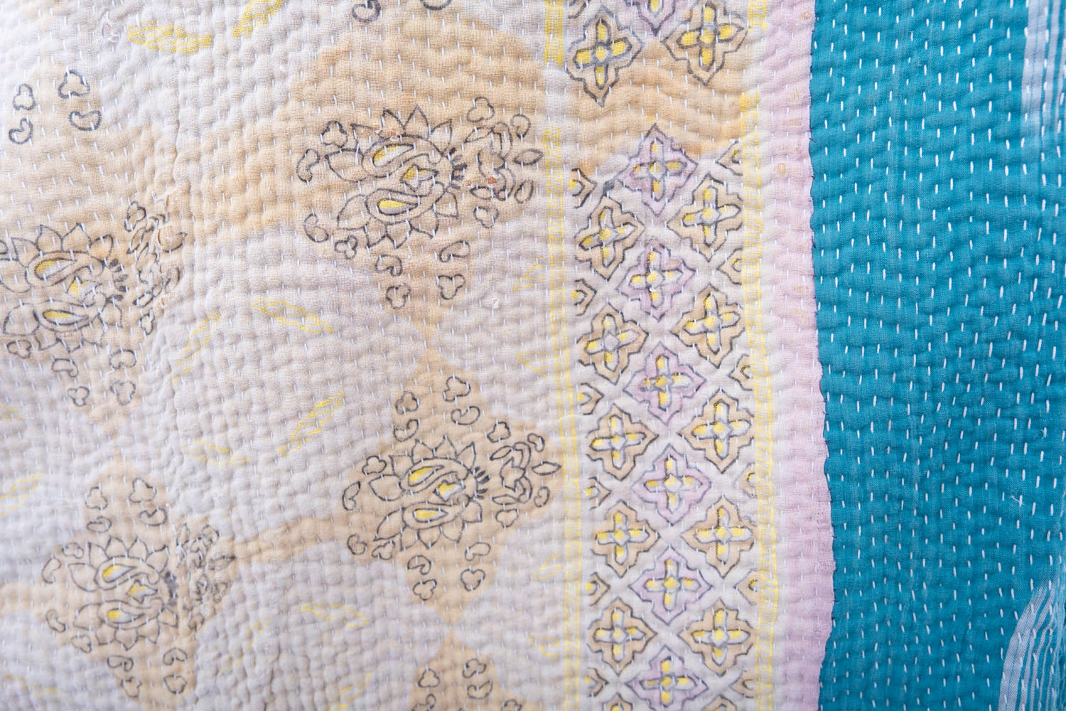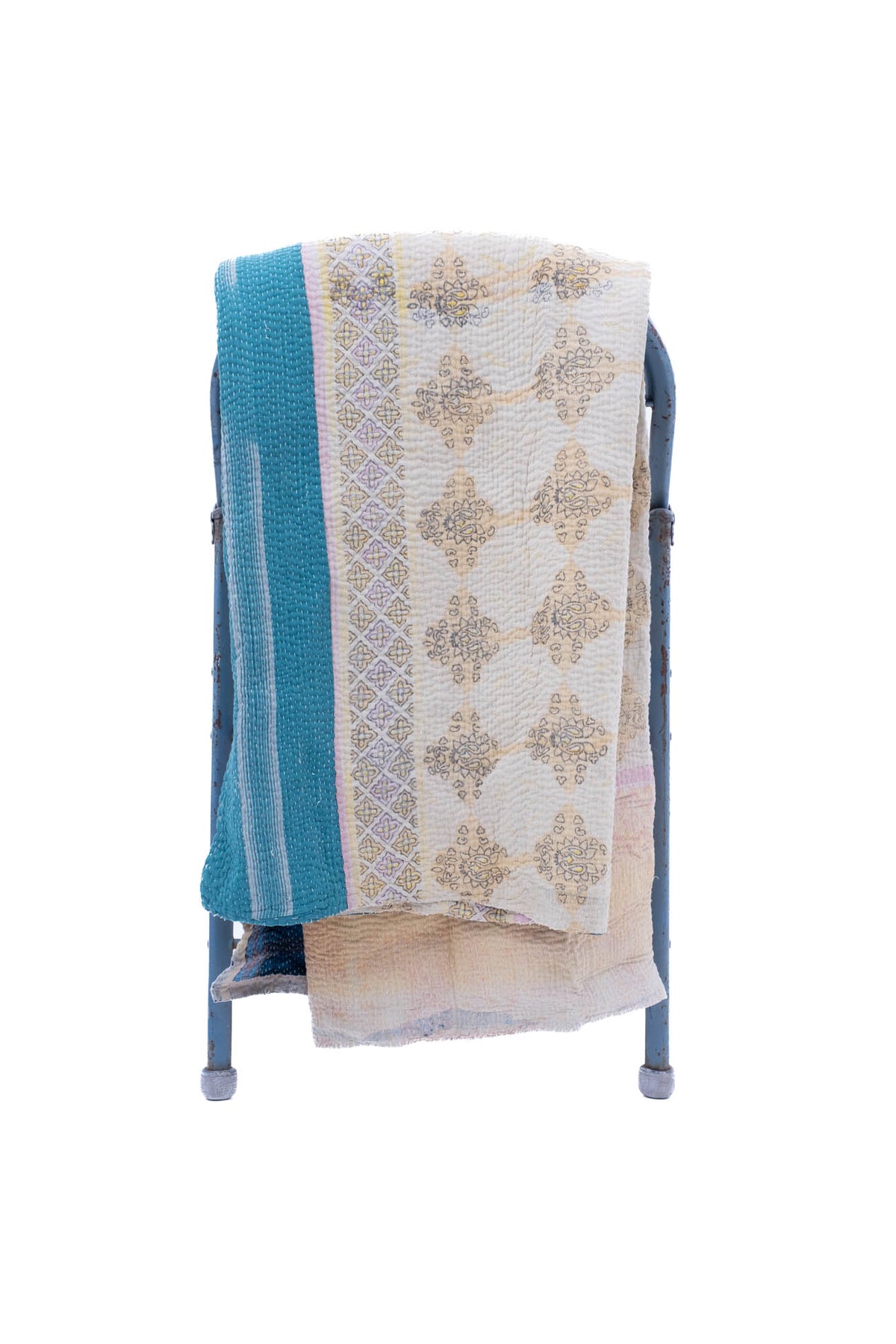 We have sourced these ridiculously charming Kantha quilts from a vintage dealer outside of Delhi. Kantha quilts are made by layering old saree’s and dhotis and stitching the layers with long running stitches that binds it all together. Our Domi Kanthas are super old, they have  amazing patching, fraying and some have a little discoloration.  Every one is a one of a kind hand made treasure.